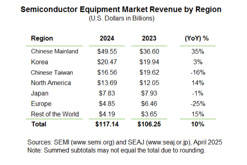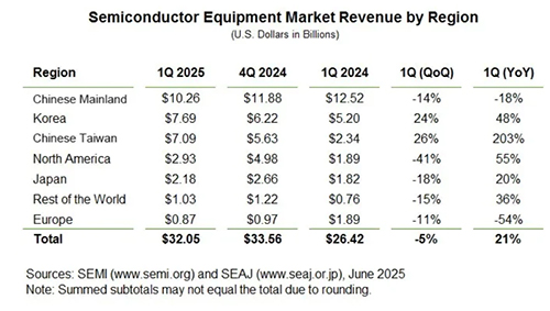 除了三强,韩国近年也持续在半导体设备领域发力。2025年Q1韩国半导体设备市场表现突出,销售额同比暴增48%至76.9亿美元,超越中国台湾连续两季成为全球第二大市场。韩国半导体设备厂商在工艺布局上呈现“前道聚焦部分领域,后道整体具备竞争力”的特点,前道设备中,其在蚀刻、清洗、沉积(尤其热处理设备)工艺技术达到全球核心水平的60%-80%,沉积、热处理和平整化设备国产化率较高,而曝光、离子注入、测量分析设备技术基础薄弱。