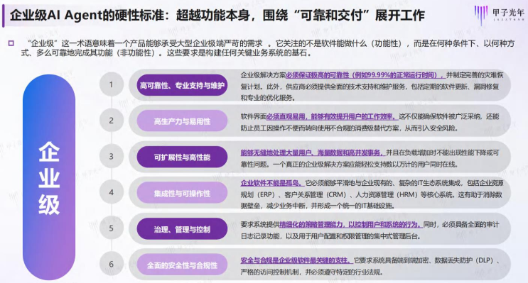 本报告提出“企业级AI Agent=大模型+工具调用+行业知识”的新公式,指出2025年Agent已从概念验证进入规模化落地期。通过金融、制造、医疗等八大行业场景地图,系统拆解Agent如何打通数据流、重塑流程并带来指数级效率提升;同时给出供应商选型五维框架、MCP/A2A协议生态及18个标杆案例。